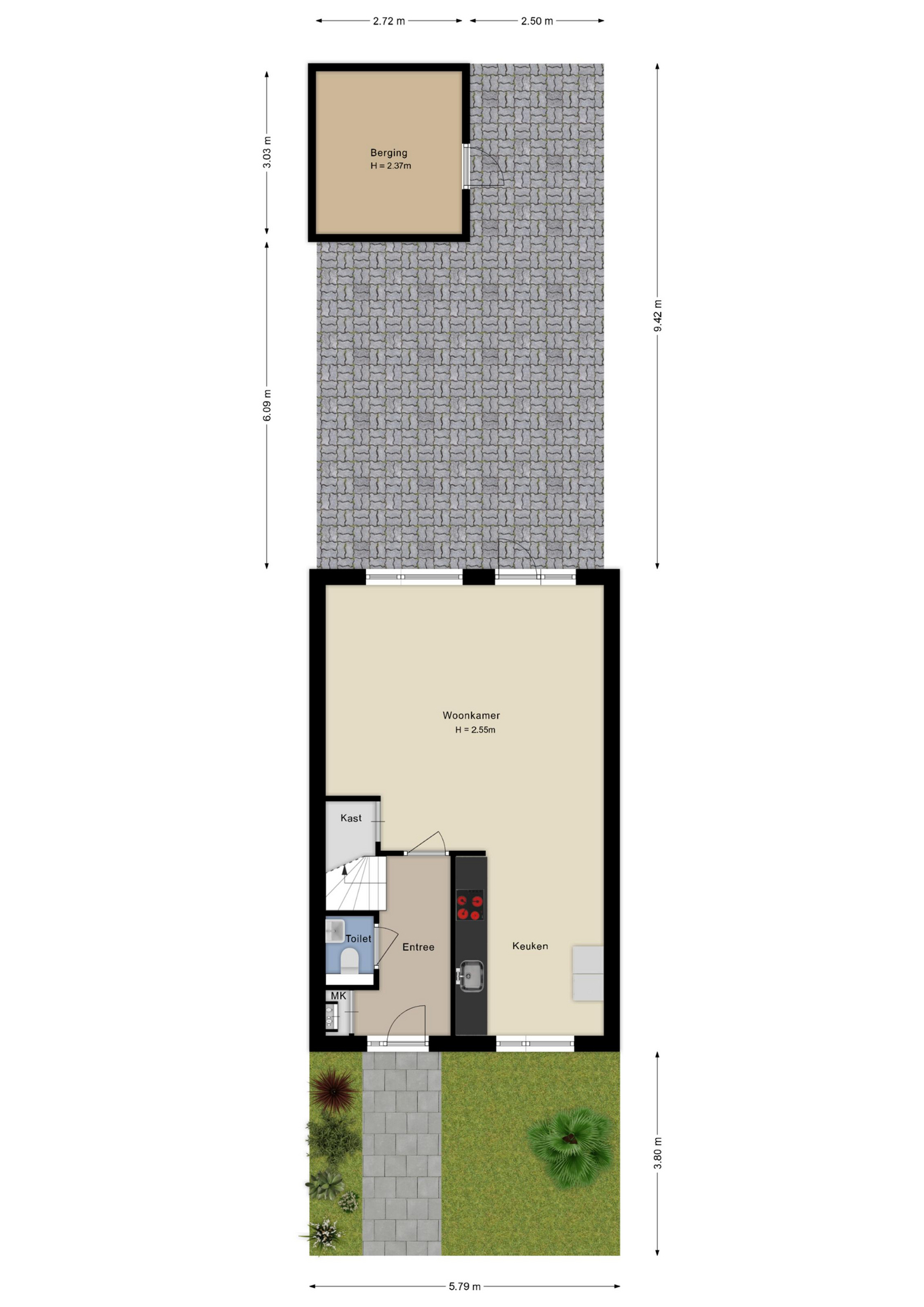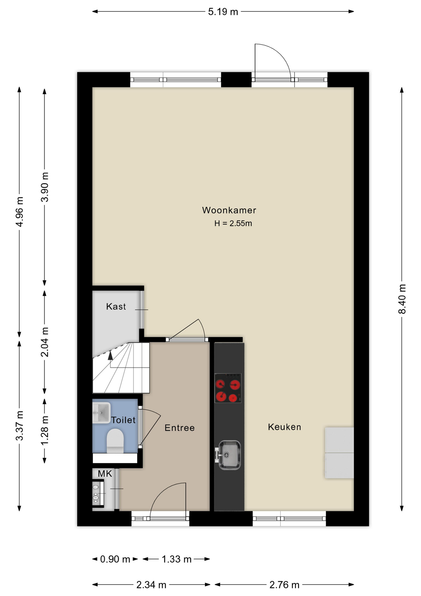 De hal/entree biedt toegang tot de ruime woonkamer, het toilet, de meterkast en trapopgang naar de eerste verdieping. De woonkamer is ca. 26 m² groot en voorzien van een trapkast en een open inbouwkeuken met diverse apparatuur. Aansluitend bevindt zich de royale achtertuin op het noordoosten met achterom.