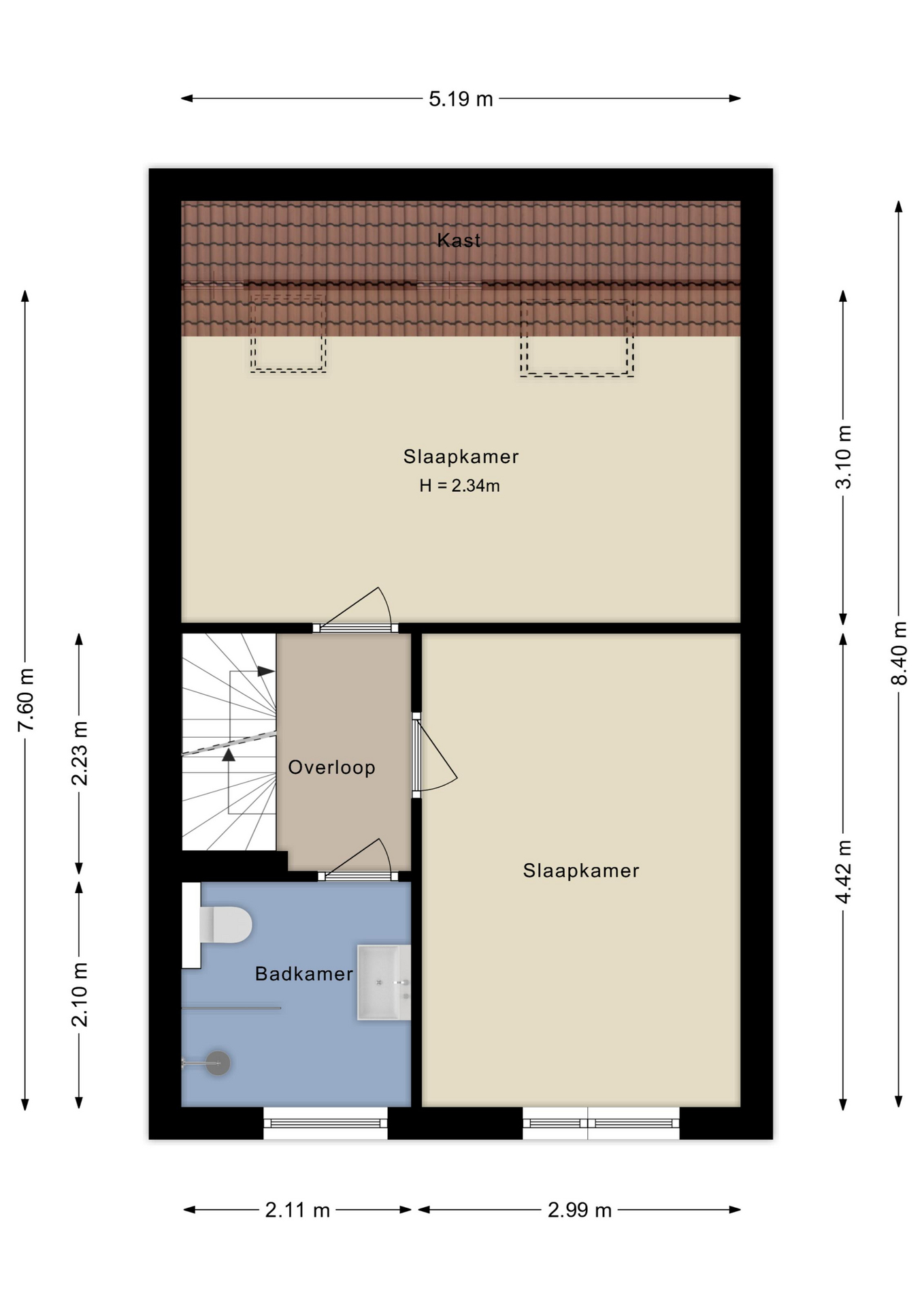 De overloop biedt toegang tot een tweetal goed bemeten slaapkamers, alsmede de badkamer met douche, toilet en wastafel.
