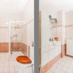 The landing includes a convenient and spacious storage closet with connections for a washing machine and dryer, as well as the central heating system. The fully tiled bathroom is fitted with a walk-in shower, a modern vanity unit with a mirror and additional storage, a second toilet, and a radiator.