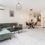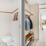 The house welcomes you with an entryway featuring a toilet and utility closet. From the hallway, you step into the spacious and bright living room. Large windows let in plenty of natural light, while the tiled flooring adds a sleek and tidy appearance. For additional comfort, the living room is equipped with air conditioning, ensuring a pleasant indoor climate even on the warmest summer days.
