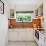The open-plan corner kitchen is equipped with all necessary built-in appliances: an induction hob, combi-oven, extractor hood, fridge-freezer, dishwasher, and a one-and-a-half sink with designer tap. A tilt-and-turn window ensures excellent ventilation while cooking and provides additional natural light.
