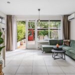 Via de entree met meterkast en moderne toiletruimte bereik je de lichte woonkamer. De woonkamer is voorzien van een plavuizenvloer en een airconditioningsunit, waardoor je zomers verzekerd bent van verkoeling. Dankzij de grote raampartijen valt er veel natuurlijk daglicht de woonkamer binnen.