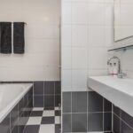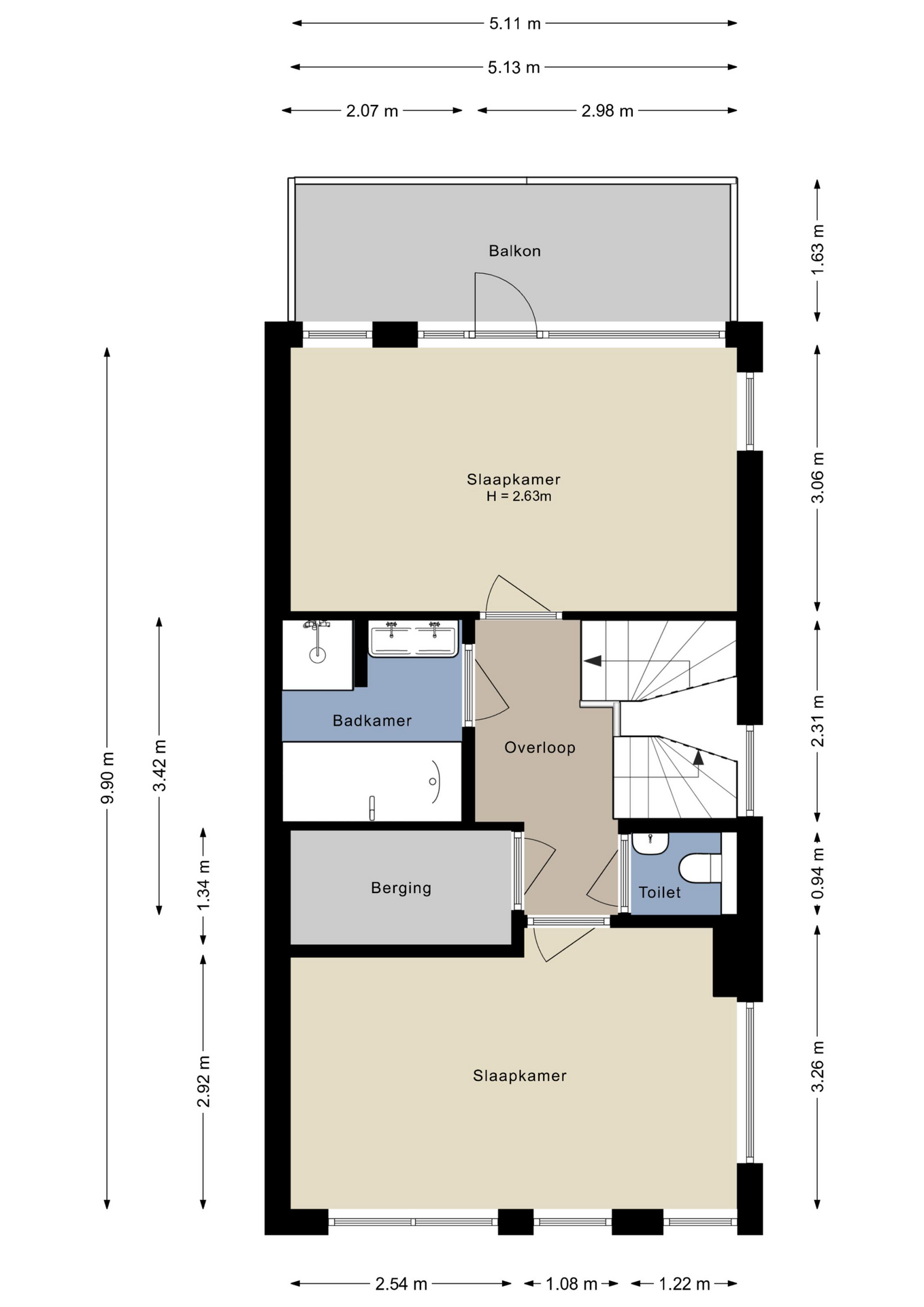Op de eerste verdieping vind je twee ruime slaapkamers die dankzij de grote raampartijen veel natuurlijk licht binnenlaten. De slaapkamer aan de achterzijde is voorzien van airconditioning en beschikt over een dakterras met uitzicht op het omliggende park. Hier vind je ook de nette badkamer, een apart toilet en een ruime berging die makkelijk weer is terug te brengen naar een extra slaapkamer.