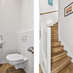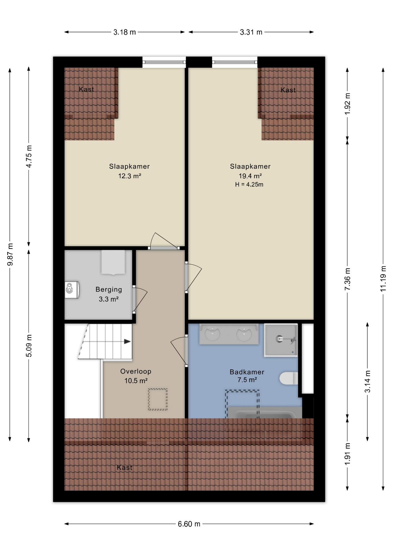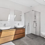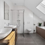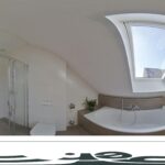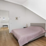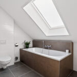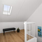 Op de eerste verdieping valt direct de royale hoogte van de nok (ca. 4,1 meter), wat zorgt voor een ruimtelijk gevoel. Hier vind je een ruime overloop met dakraam, twee riante slaapkamers en een luxe badkamer met ligbad, inloopdouche, dubbele wastafel en een tweede toilet.