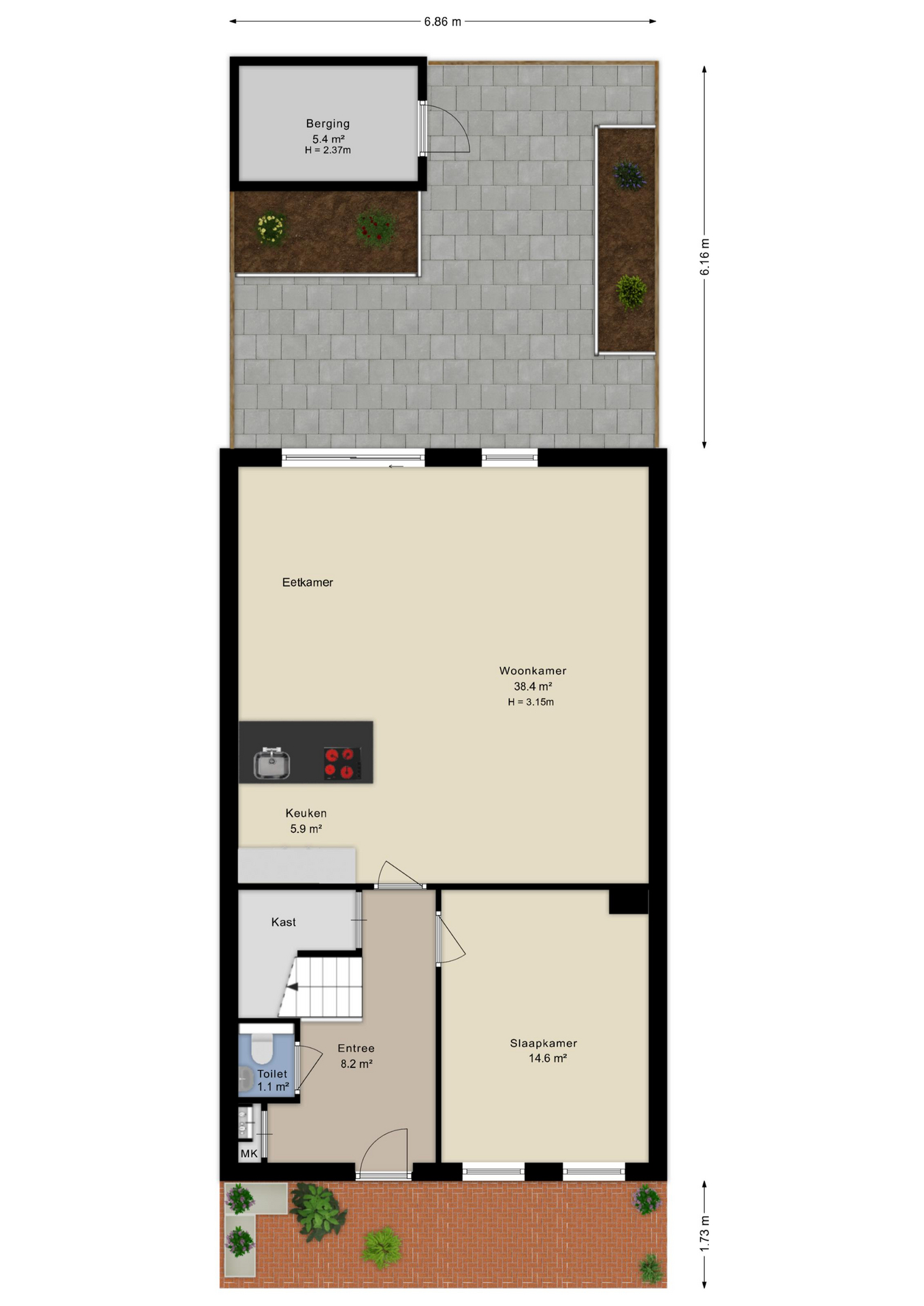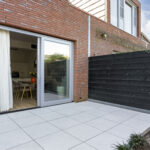 De beschutte achtertuin is recent (februari 2025) opnieuw bestraat en beschikt over een houten berging en achterom. Bovendien heb je de beschikking over een eigen parkeerplaats op het achtergelegen mandelige terrein.