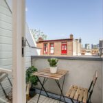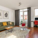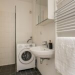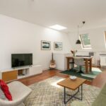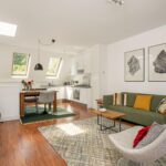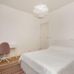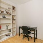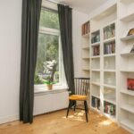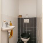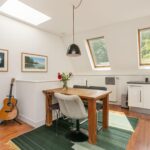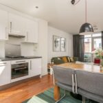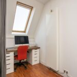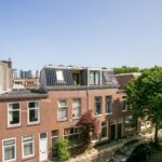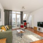 De woonkamer is ruim en licht, en loopt over in de open keuken. Aan de voorzijde is een fijne werkplek gemaakt, met toegang tot het balkon. Doordat de overburen nog geen opbouw hebben geplaatst, kijk je vrij uit over de daken richting de skyline van Utrecht – een verrassend uitzicht.