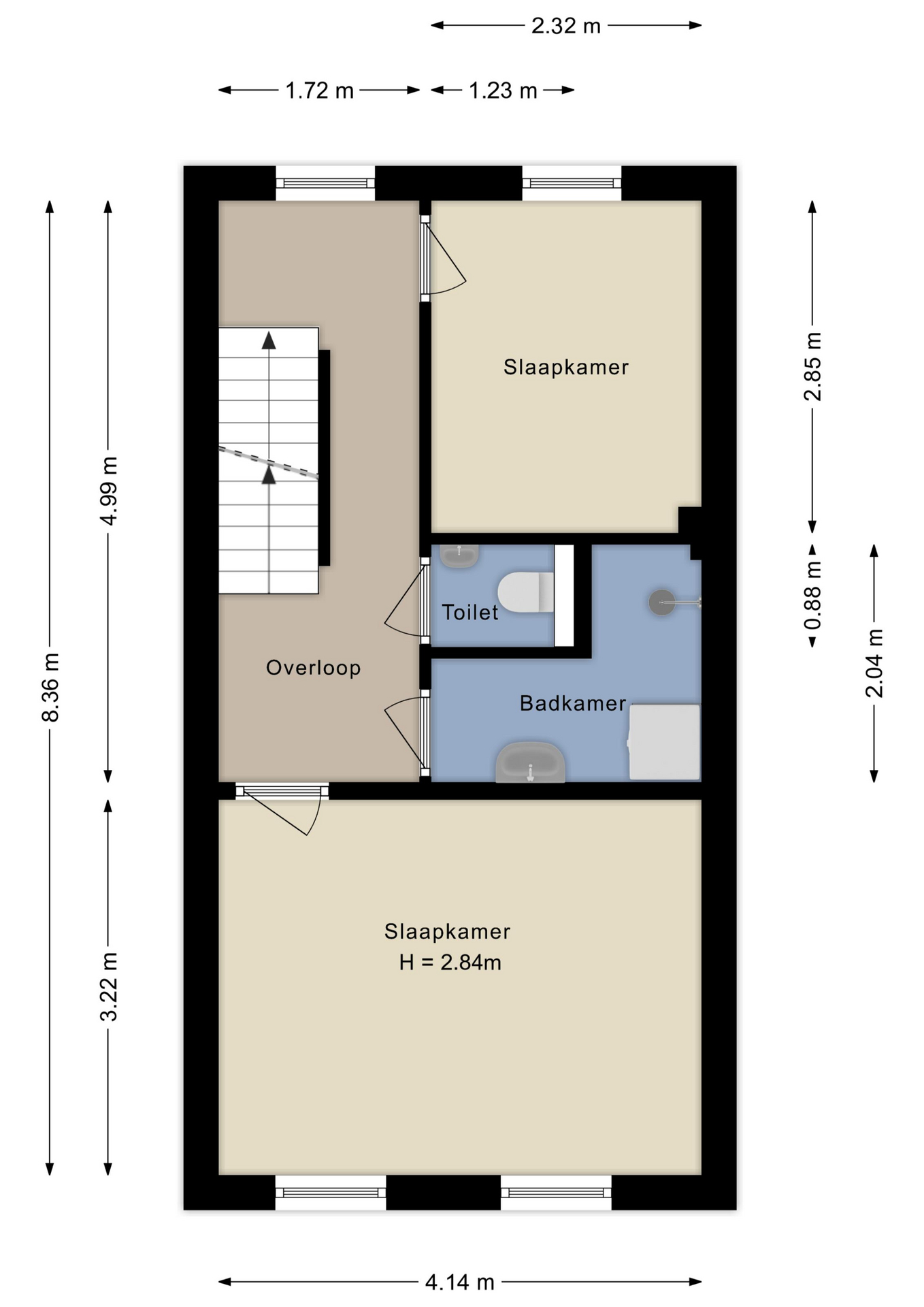 De slaapkamers bevinden zich op de eerste verdieping. Aan de voorzijde ligt een fijne twee (slaap)kamer, ideaal als bijvoorbeeld babykamer of werkkamer. Aan de voorzijde vind je de master bedroom van maar liefst 13 m². Tussen de slaapkamers in ligt de badkamer, met een inloopdouche, wastafel, medicijnkastje en aansluiting voor de wasmachine. Op deze verdieping vind je tevens een apart toilet.
