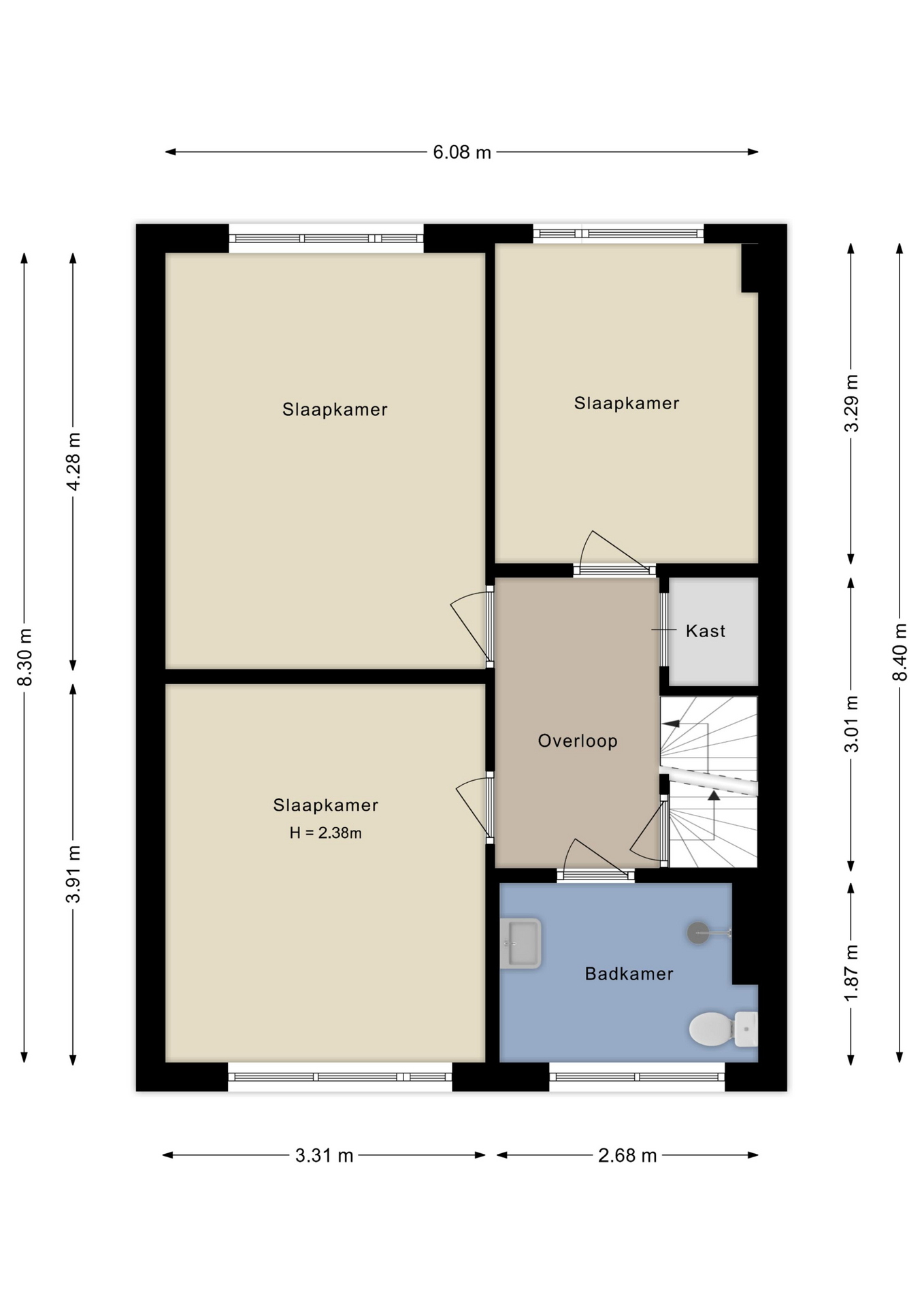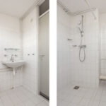 De overloop geeft toegang tot drie ruime slaapkamers en een grote vaste kast. Twee slaapkamers bevinden zich aan de achterzijde van de woning, één aan de voorzijde. De badkamer, eveneens aan de voorzijde, is voorzien van een wastafel, douche, tweede toilet en aansluiting voor de wasmachine.