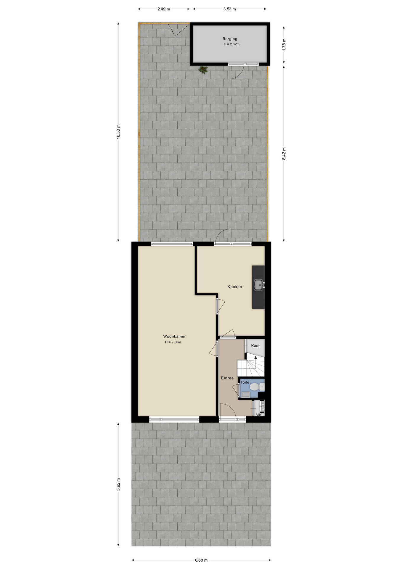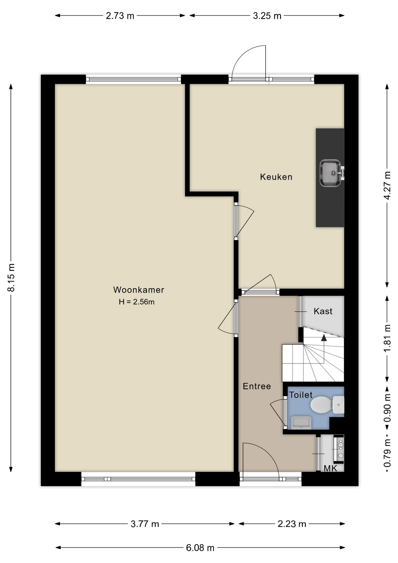 Bij binnenkomst kom je in de hal met trapkast, meterkast en toilet met fontein. Vanuit de hal bereik je de woonkamer, die dankzij de royale afmetingen en grote ramen aan beide zijden heerlijk licht en ruimtelijk is. Dit is de perfecte basis voor jouw toekomstige droomwoonkamer. De dichte keuken is bereikbaar via zowel de woonkamer als de hal. Het oorspronkelijke keukenblok is verwijderd, waardoor je hier direct met je eigen ideeën aan de slag kunt. Vanuit de keuken stap je zo de achtertuin in.