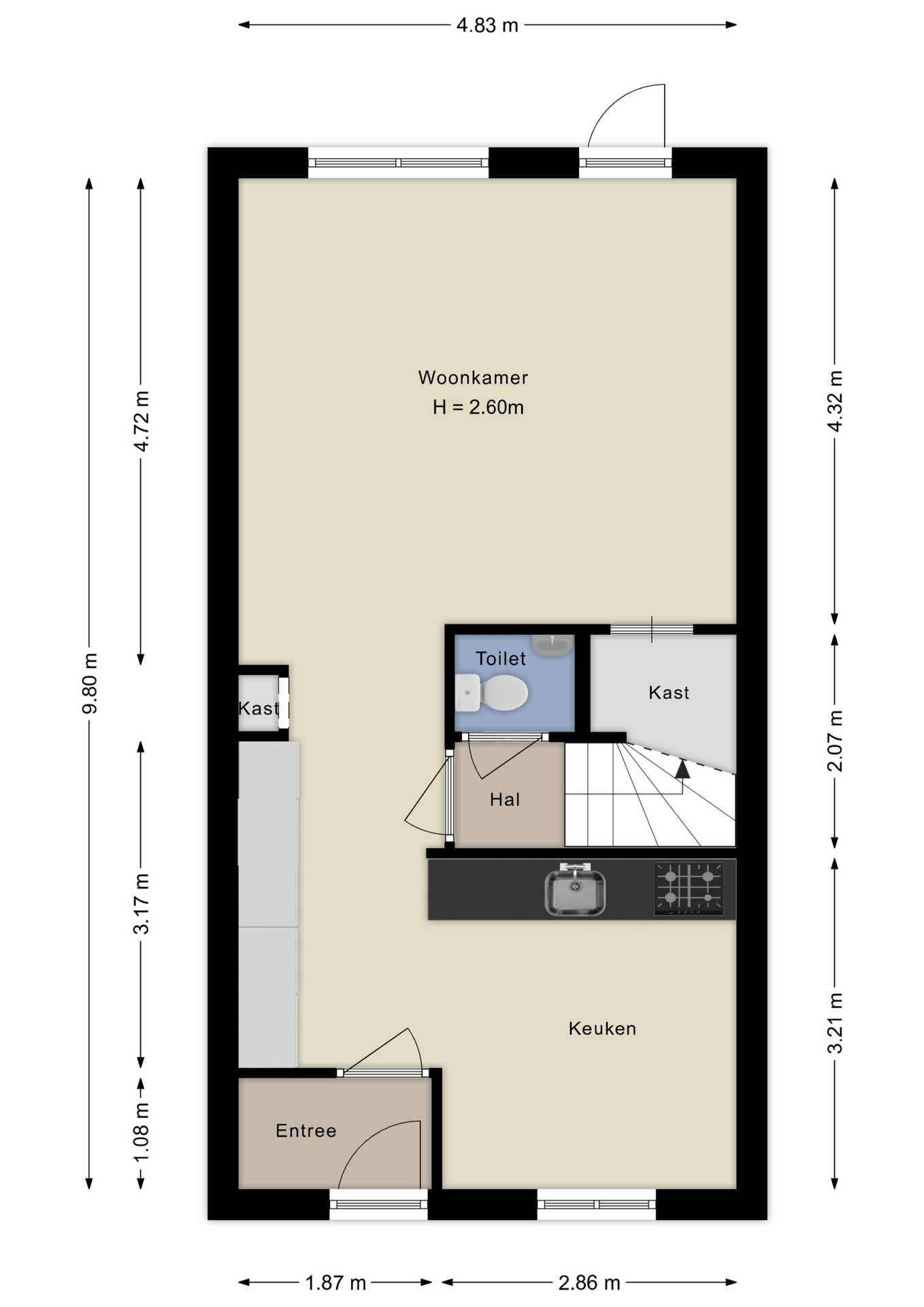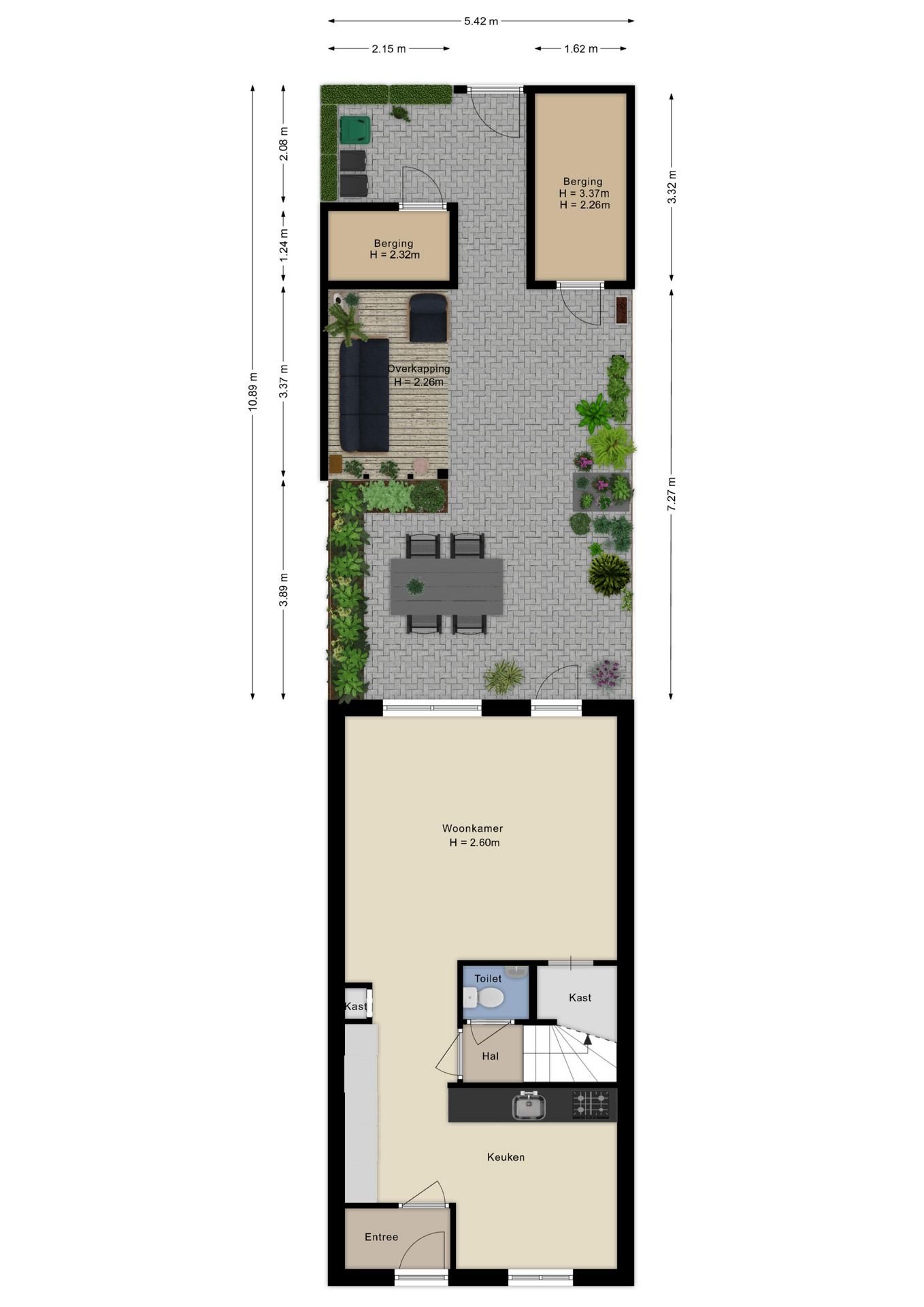 De entree/hal, biedt toegang tot de keuken, die in directe verbinding staat met de lichte woonkamer. Vanuit de woonkamer is achtertuin te bereiken en de tussenhal met toilet en trapopgang. De achtertuin beschikt over een moderne overkapping, twee houten bergingen en een achterom.