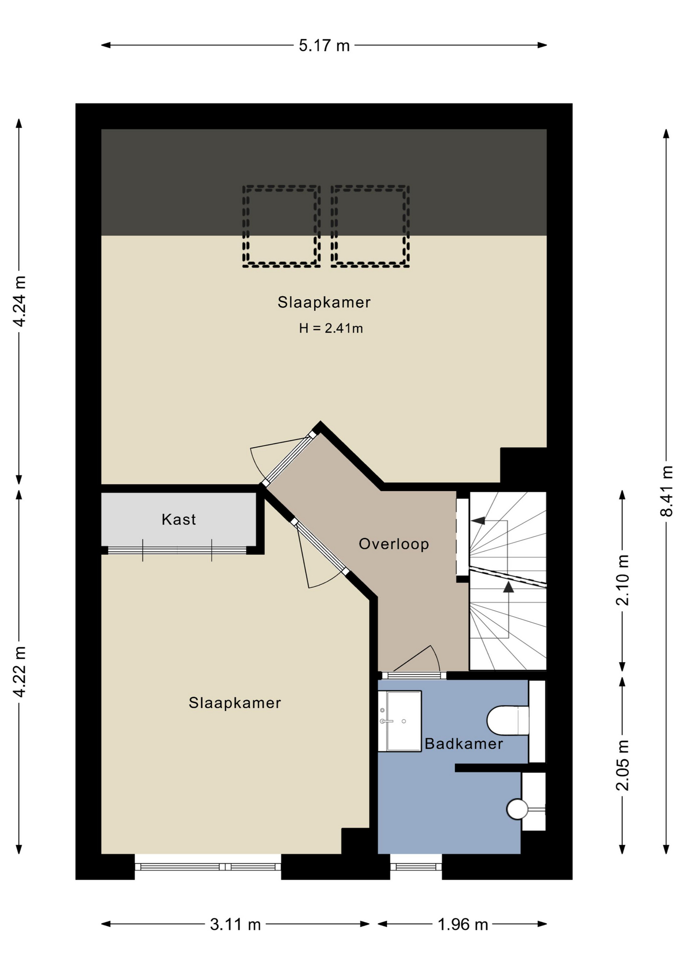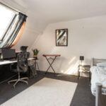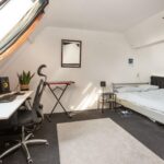 Overloop die toegang biedt naar de 2 grote slaapkamers (mogelijkheid voor 3) met laminaatvloer. De slaapkamer aan de voorzijde heeft een inbouwkast. Badkamer met inloopdouche, toilet en wastafelmeubel.