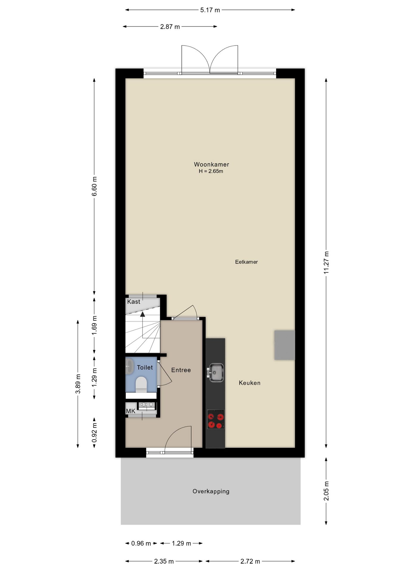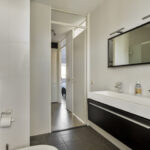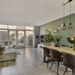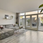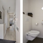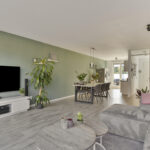 Je komt binnen in de hal met meterkast en toiletruimte. De uitgebouwde woonkamer is ruim, licht en strak afgewerkt. Grote raampartijen en openslaande deuren naar de tuin geven een fijne verbinding met buiten. De doorlopende pvc-vloer met vloerverwarming maakt het geheel comfortabel en onderhoudsvriendelijk.
