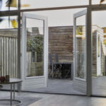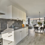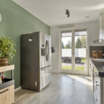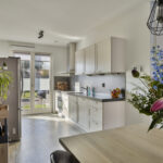Aan de voorzijde ligt de moderne open keuken met een strak werkblad, kasten en lades voor een luxe sfeer. De keuken is compleet uitgerust met onder meer een inductiekookplaat, afzuigkap, combi-oven, vaatwasser, koelkast en vriezer. Ook hier zorgen openslaande deuren voor extra licht, uitzicht en ventilatie tijdens het koken.