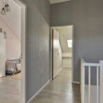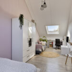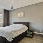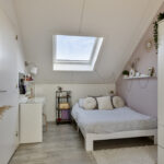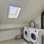 Op de bovenste woonlaag kom je via de voorzolder met een praktische wasruimte met witgoedaansluitingen en extra bergruimte. Daarnaast is er een grote slaapkamer over de volle lengte van het huis inclusief handige knieschotten. Dankzij de grote ramen is het hier aangenaam licht; de nette laminaatvloer maakt het af.
