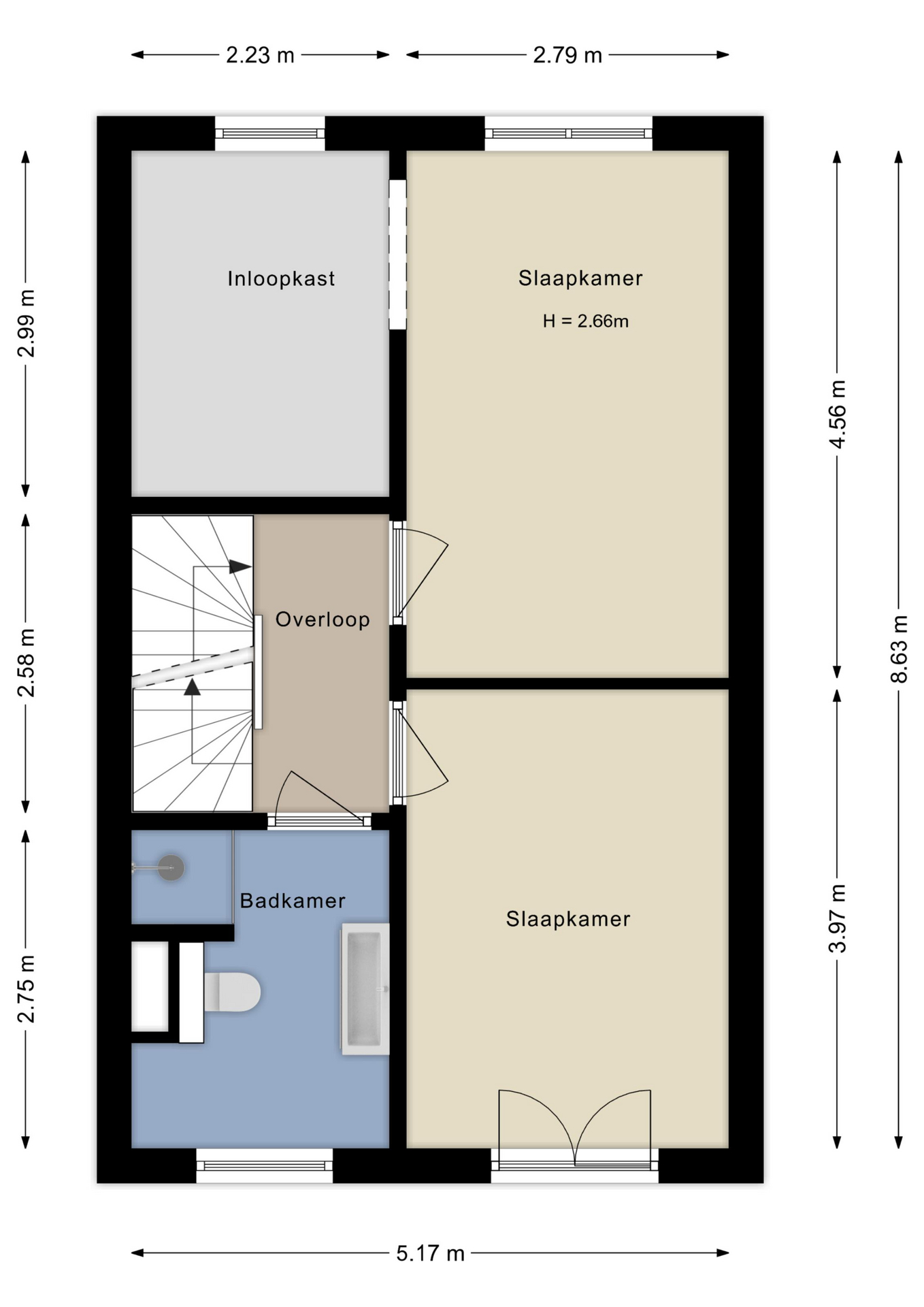 Drie grote slaapkamers, eenvoudig uit te breiden naar vier/vijf