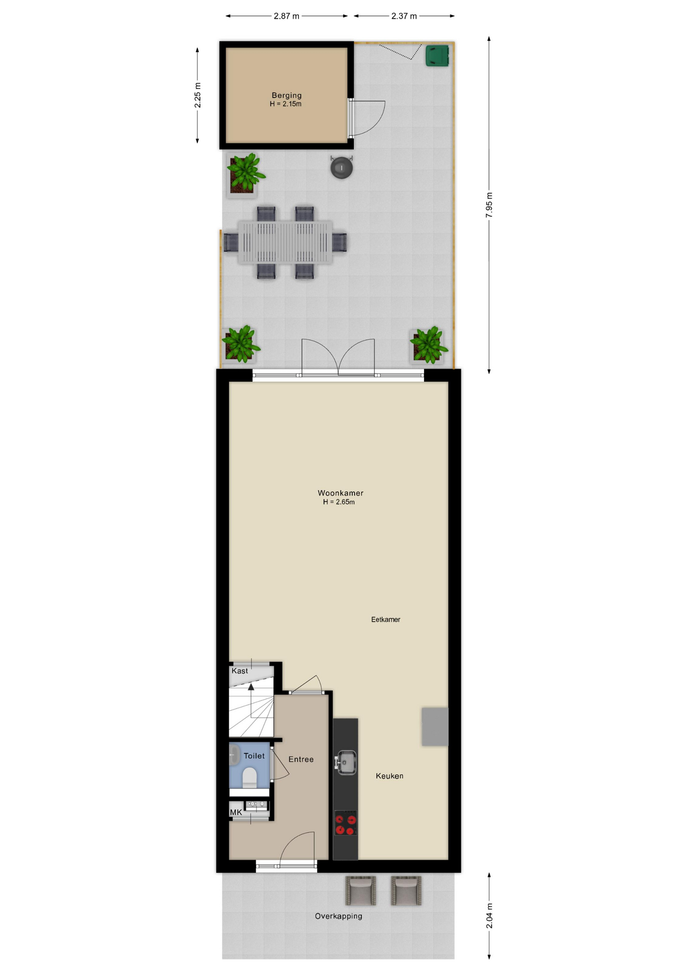 De achtertuin is een echte troef: lekker ruim, gelegen op het noordoosten, maar dankzij de diepte geniet je de hele dag van de zon. De tuin is onderhoudsvriendelijk aangelegd met sierbestrating. Achterin staat een ruime berging met plek voor meerdere fietsen, en via de achterom kom je gemakkelijk met de fiets of het tuinmateriaal binnen.