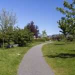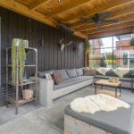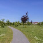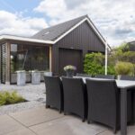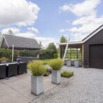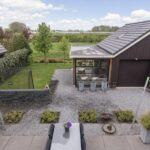 Voortuin met dichte heg, grindterras, oprit met parkeergelegenheid voor 2 auto’s en laadpaal voor elektrisch rijden; achtertuin op het zuidwesten met vrij uitzicht over het park, terras, bloembakken, gazon, tuinkamer en garage met vliering.
