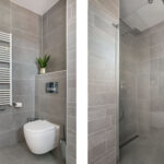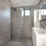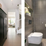 Op de eerste verdieping bevinden zich drie slaapkamers (circa 11 m², 13 m² en 7 m²) en een moderne badkamer met vloerverwarming, inloopdouche, dubbele wastafel met spiegelkast en tweede toilet.
