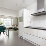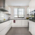 De open keuken aan de voorzijde is hoogwaardig afgewerkt met een composiet aanrechtblad en hoogglans witte fronten. De keuken is compleet uitgerust met Siemens-apparatuur, waaronder een inductiekookplaat, afzuigkap, combi-oven/magnetron, grote koelkast, vaatwasser, inbouw-koffiezetapparaat en warmhoudlade, evenals een Quooker voor direct kokend water.