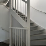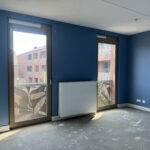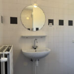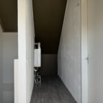 Overloop. Twee ruime slaapkamers, één aan de voorzijde en één aan de achterzijde, beide voorzien van een Frans balkon. De volledig betegelde badkamer beschikt over een douche, zwevend tweede toilet, wastafel en een raam dat open kan voor natuurlijke ventilatie.