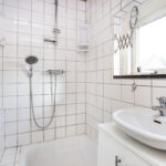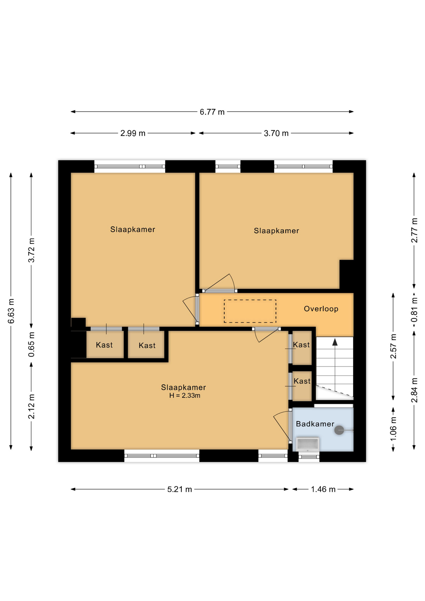 Via de overloop bereik je drie slaapkamers: één aan de voorzijde en twee aan de achterzijde van de woning. De compacte badkamer is bereikbaar via de slaapkamer aan de voorzijde en beschikt over een douche, wastafel en een raam voor daglicht en ventilatie.