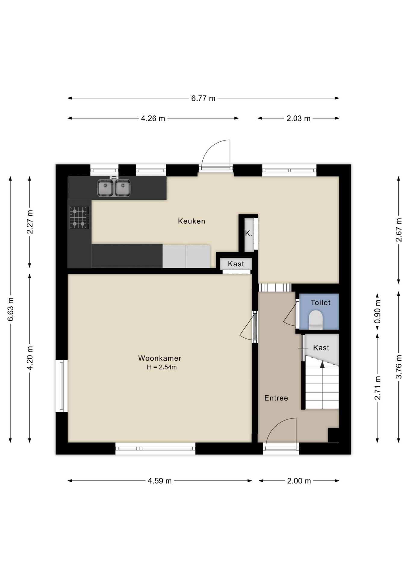 Je komt binnen via de entree in de hal met trapopgang, handige trapkast en een separaat toilet met fonteintje. Vanuit hier zijn zowel de woonkamer als de keuken bereikbaar. De woonkamer aan de voorzijde beschikt over een vaste kast en fijne lichtinval. Aan de achterzijde vind je de eetkamer en de keuken, ingericht met een U-vormig keukenblok en witgoedaansluiting. Vanuit de keuken is er toegang tot de achtertuin.