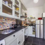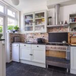 De open keuken is voorzien van een Belgische hardstenen vloer, raam, deur met kruisroeden richting tuin en hoekkeuken. In de sfeervolle keuken bevinden zich bovenkasten, wandplanken, een roestvrijstalen afzuigkap, mozaïektegeltjes aan de achterwand, oven gasfornuis, vaatwasser en koelkast.