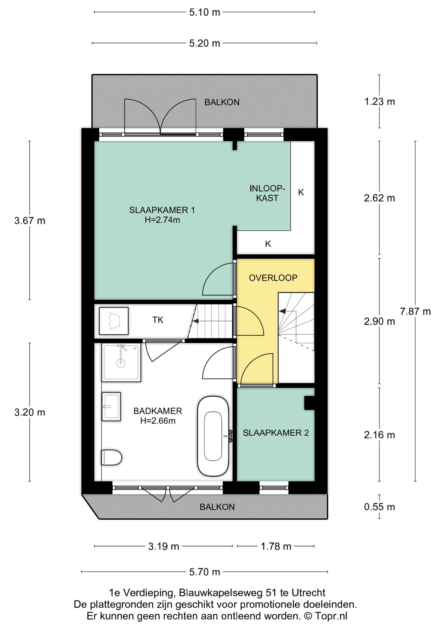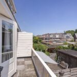 Op de 1e verdieping bevinden zich over de volle breedte van de woning, twee balkons. Het smalle balkon aan de voorzijde van ca. 3 m² (gesitueerd op het zuidwesten) grenst aan de badkamer en heeft muren rondom. Het balkon aan de achterzijde van ruim 6 m² (gesitueerd op het noordoosten) grenst aan de master bedroom en is voorzien van houten vloertegels, tussenwanden en een witte balustrade.