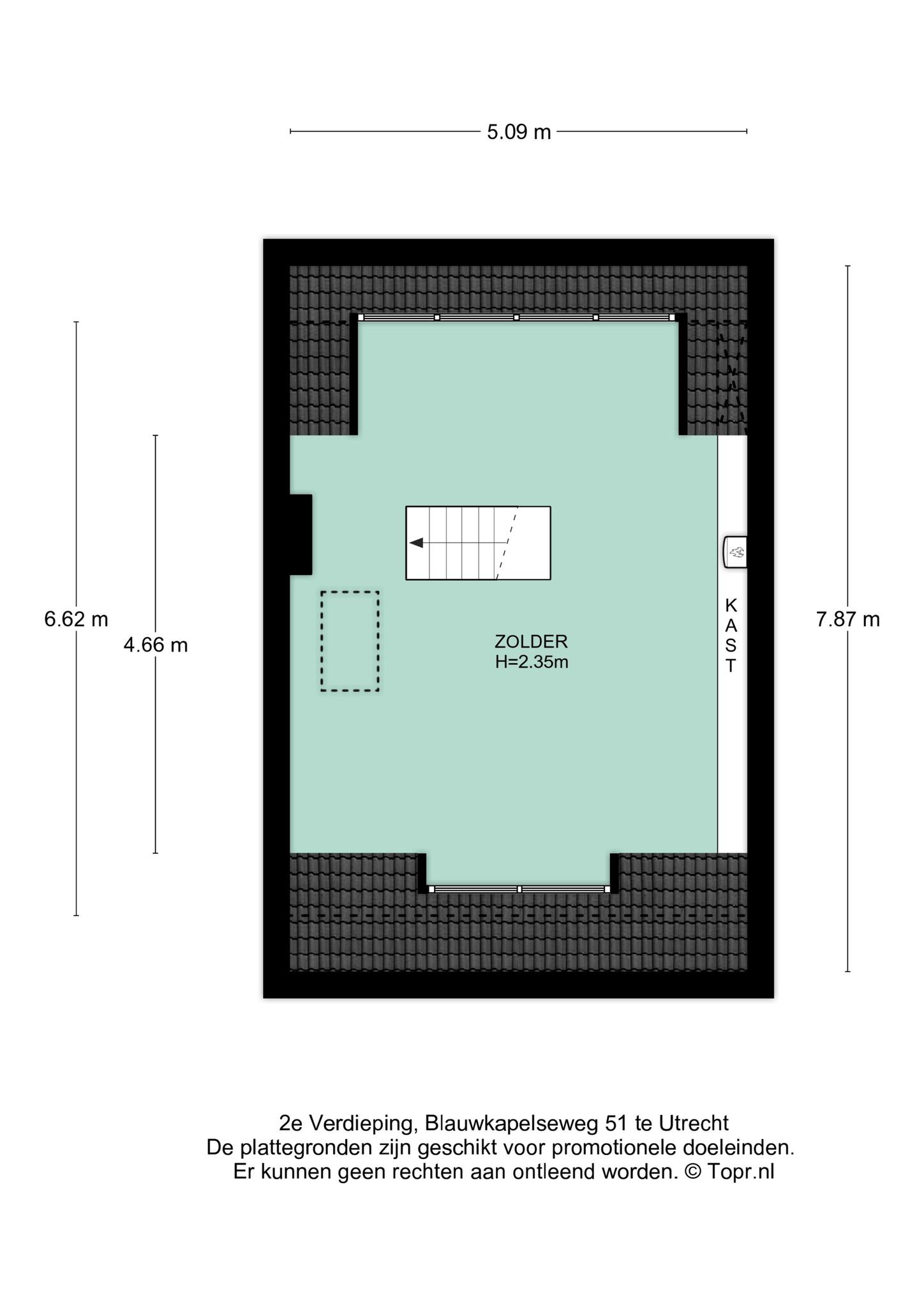De 2e verdieping is een grote, open ruimte, voorzien van twee dakkapellen: een grote aan de achterzijde en een kleinere aan de voorzijde. Aan de rechterzijwand bevindt zich een brede inbouwkast met daarin de cv-installatie en een aparte kledingkast. Deze ruimte is door zijn grote oppervlakte en vele lichtinval prima in te richten als (ouder)slaapkamer, werkkamer en/of relaxruimte. Ook het eenvoudig splitsen in twee (slaap)kamers behoort tot de mogelijkheden.