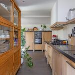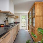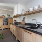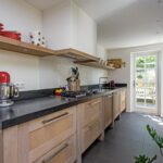 De keuken is ambachtelijk gemaakt van massief eiken, met een 4,20 meter lang natuurstenen werkblad van 90 cm diep – dus volop ruimte. De extra diepe lades bieden veel opbergruimte. Er is een oven met pyrolyse-reiniging en een aparte stoomoven. Ook hier een deur naar de tuin.