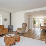 • Een sfeervolle woonkamer met strak afgewerkte wanden, plavuizenvloer en een gezellige houtkachel – perfect voor knusse winteravonden.
