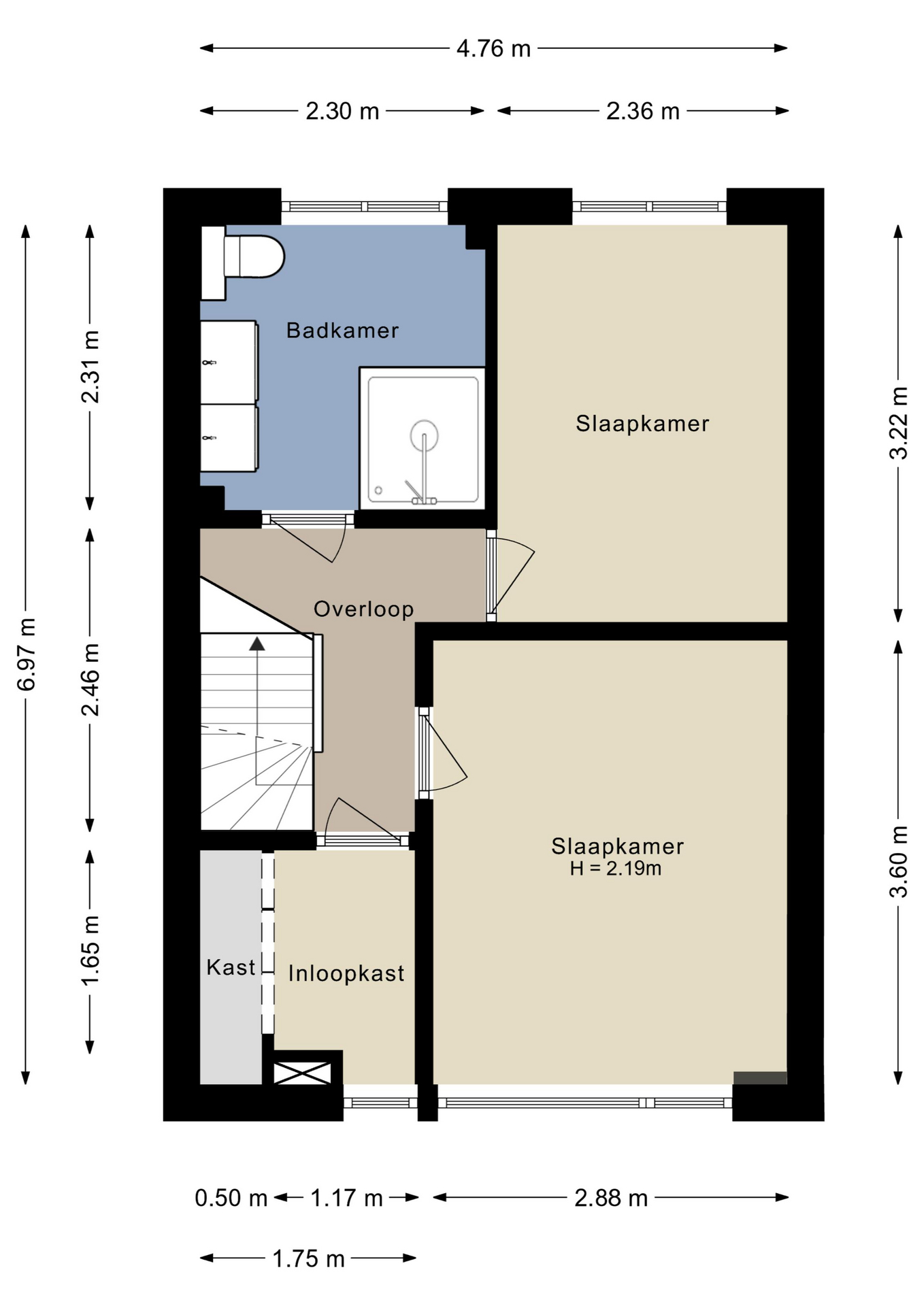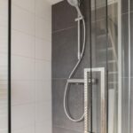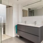 Overloop met toegang tot de moderne badkamer voorzien douche en wastafelmeubel en toilet, 2 ruime slaapkamers en een kleinere kamer die momenteel dienst doet als kastenkamer.