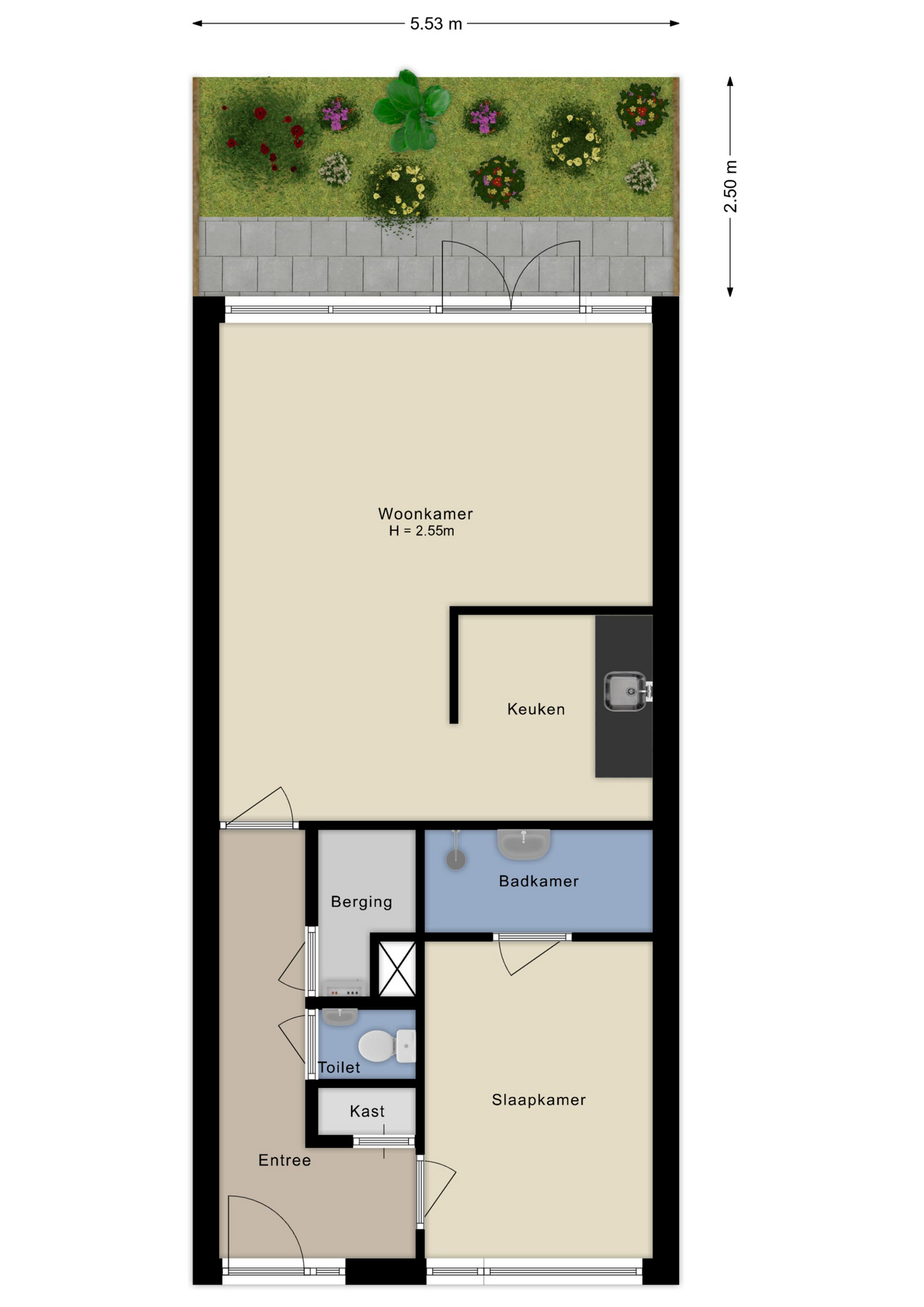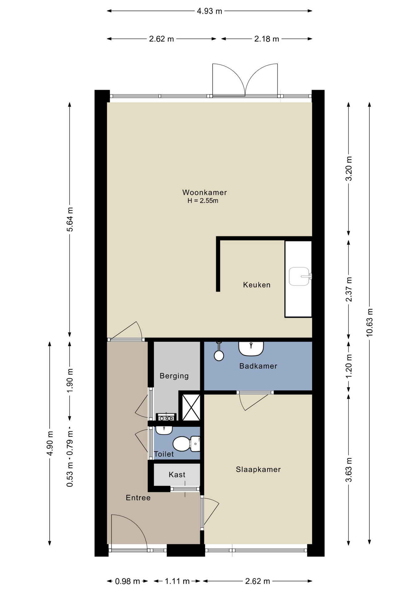 - Twee separate bergingen in onderbouw te bereiken.