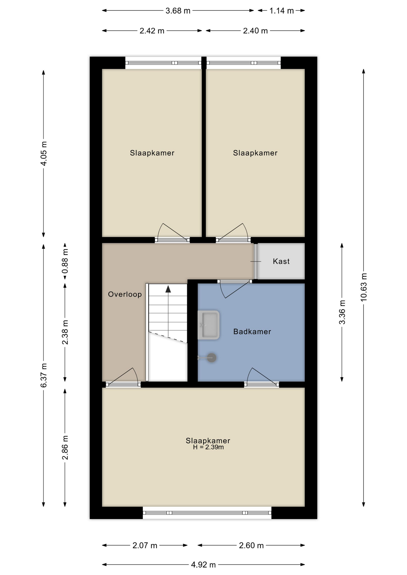 Via de vaste trap kom je op een ruime L-vormige overloop met toegang tot alle vertrekken. Aan de voorzijde ligt de royale hoofdslaapkamer over de volle breedte van de woning, met directe toegang tot de badkamer. Aan de achterzijde zijn nog twee slaapkamers, ideaal als kinder-, werk- of logeerkamer. De badkamer is praktisch ingericht met een douche, wastafel en aansluiting voor de wasmachine.