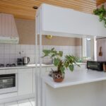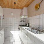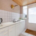 De open keuken ligt aan de achterzijde van de woning, heeft een gezellig barretje en is voorzien van diverse (inbouw)apparatuur; 4-pits gasfornuis, afzuigkap en oven (defect). Via de keuken is ook de achtertuin toegankelijk.