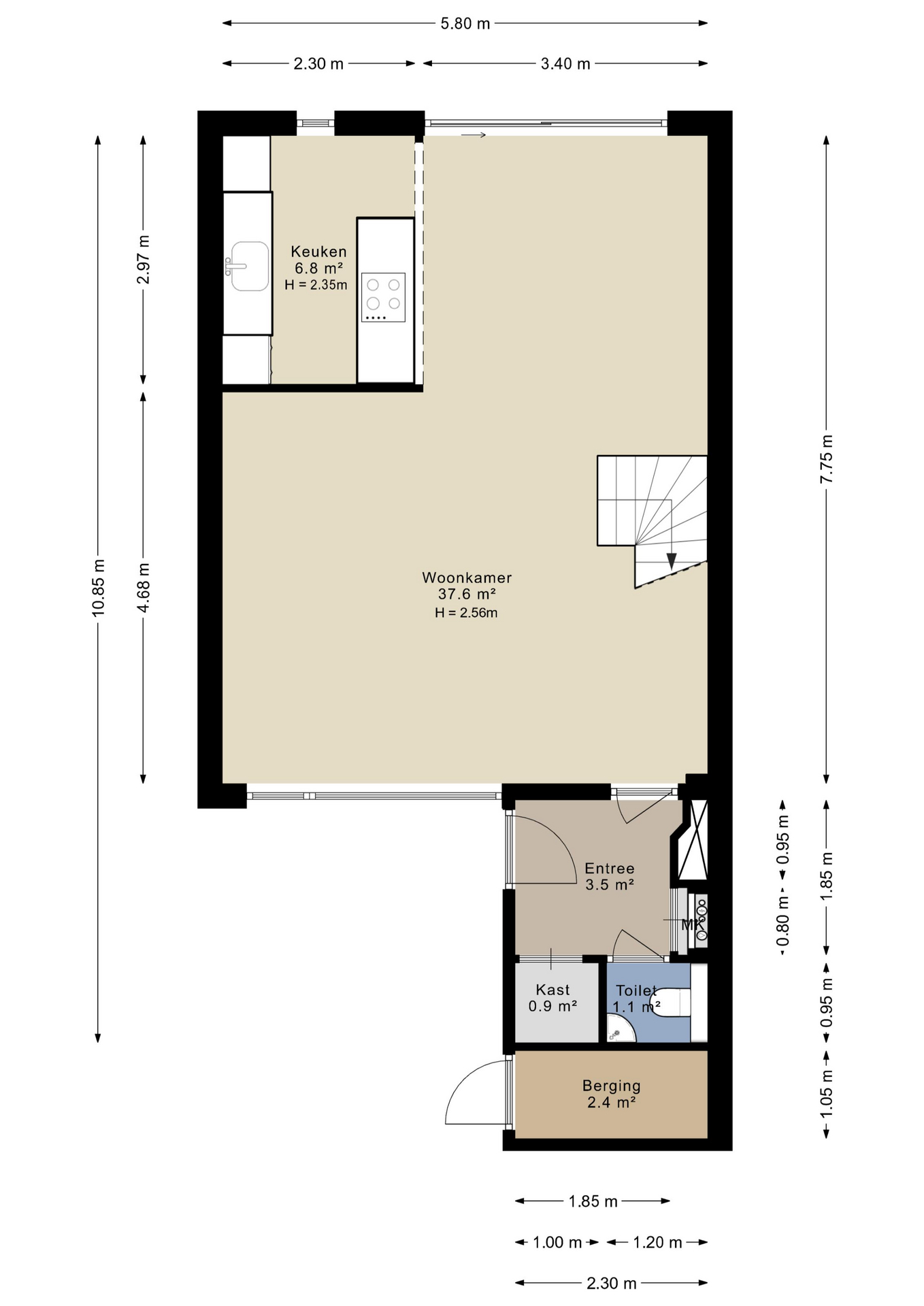 Voortuin met toegang tot de stenen berging en voordeur. Via de voordeur kom je in de ruime hal met toegang tot de meterkast (vernieuwd in juli 2024), toiletruimte, bergruimte en de woonkamer. De luxe toiletruimte is voorzien van een hangend toilet, fonteintje en vloerverwarming.