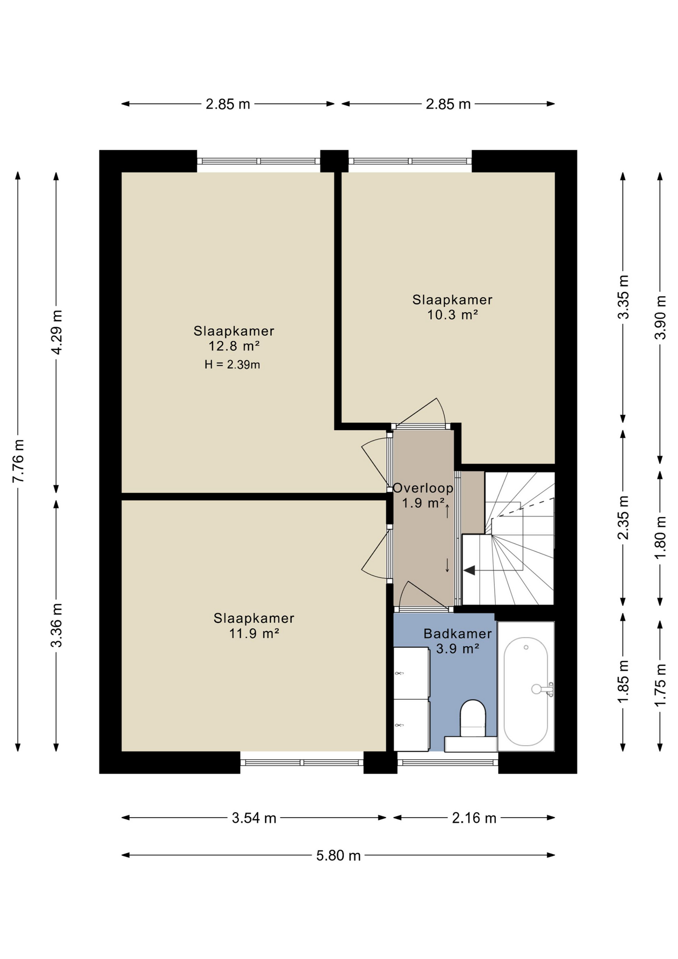 De eerste ruime slaapkamer, van circa 12 m² ligt aan de voorzijde van de woning. De tweede en derde slaapkamer zijn circa 13 en 10 m² groot, deze bevinden zich aan de achterzijde van de woning. Alle slaapkamers zijn voorzien van een laminaatvloer.