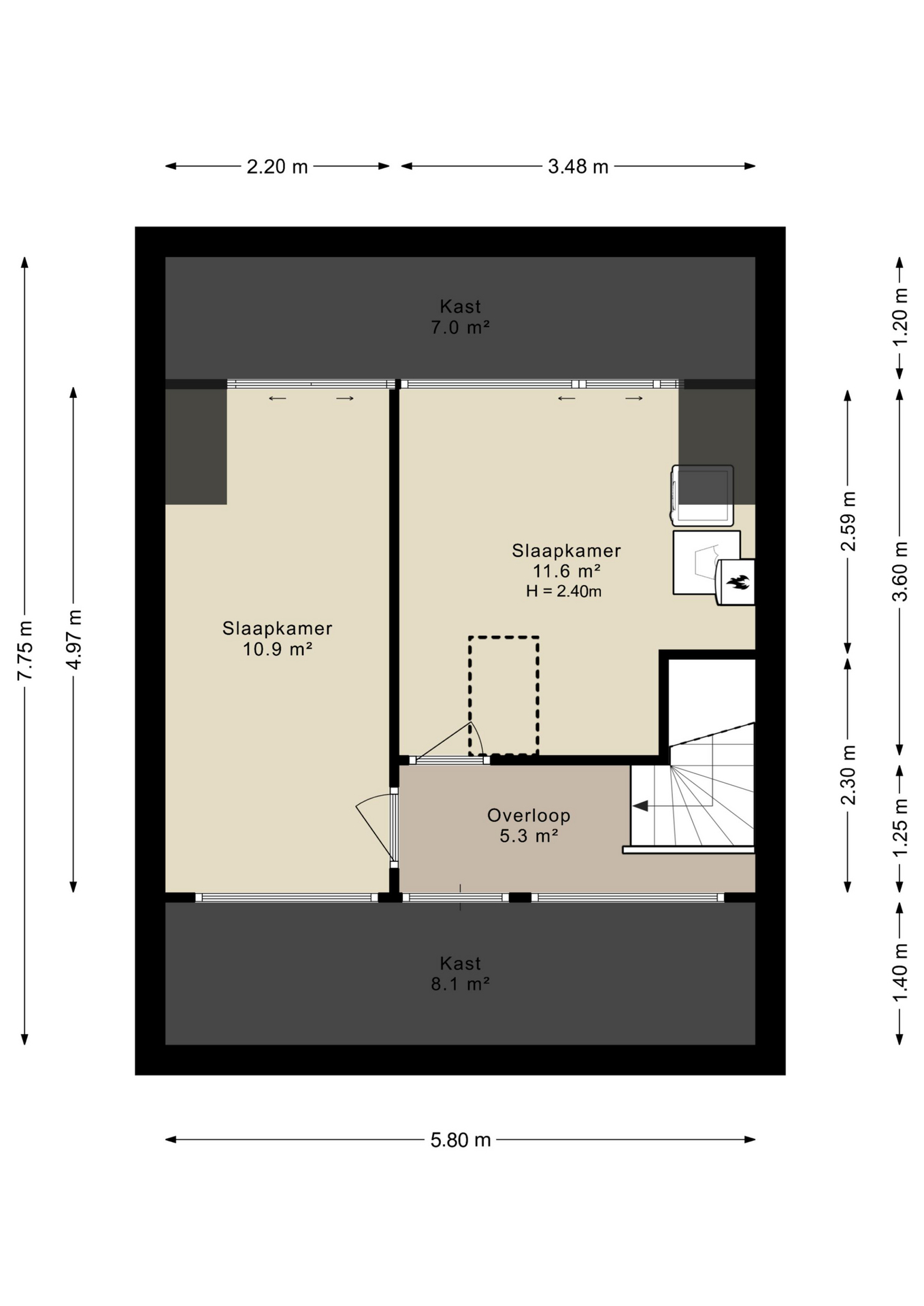Via de trapopgang bereik je de tweede verdieping met voorzolder welke toegang biedt tot twee slaapkamers en bergruimte achter de knieschotten. De vierde en vijfde slaapkamer zijn beide circa 11 m² groot en voorzien van een dakkapel (geplaatst in 2023), een laminaatvloer en glad gestucte wanden en plafonds. Vanuit een van de slaapkamers is de vliering bereikbaar met veel bergruimte. In deze kamer bevinden zich ook C.V. opstelling (Remeha, bouwjaar 2011), witgoedaansluitingen en een wastafel.