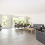 De tuingerichte woonkamer geeft een mooi uitzicht, door de grote schuifpui, over de achtertuin. Op de begane vloer ligt een plavuizenvloer in houtlook met vloerverwarming. Aan de voorzijde is de moderne keuken gesitueerd. De keuken met kookeiland is voorzien van een gaskookplaat, afzuigkap, koelkast, vrieskast, vaatwasser en combimagnetron. Prettig zijn de grote ramen en de mogelijkheid tot natuurlijke ventilatie.