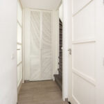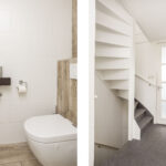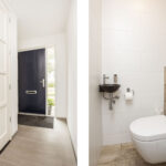 Via de voortuin kom je bij de entree van de woning. De hal geeft toegang tot de meterkast, toiletruimte en de eerste verdieping, een handige trapkast en de toegangsdeur naar de woonkamer. De moderne toiletruimte is voorzien van een hangend closet en fonteintje.