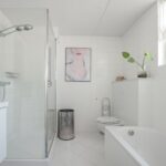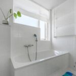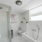 De lichte nette badkamer is volledig betegeld en voorzien van een hangend closet, douche, ligbad, wastafelmeubel met spiegelkast, designradiator en groot raam.