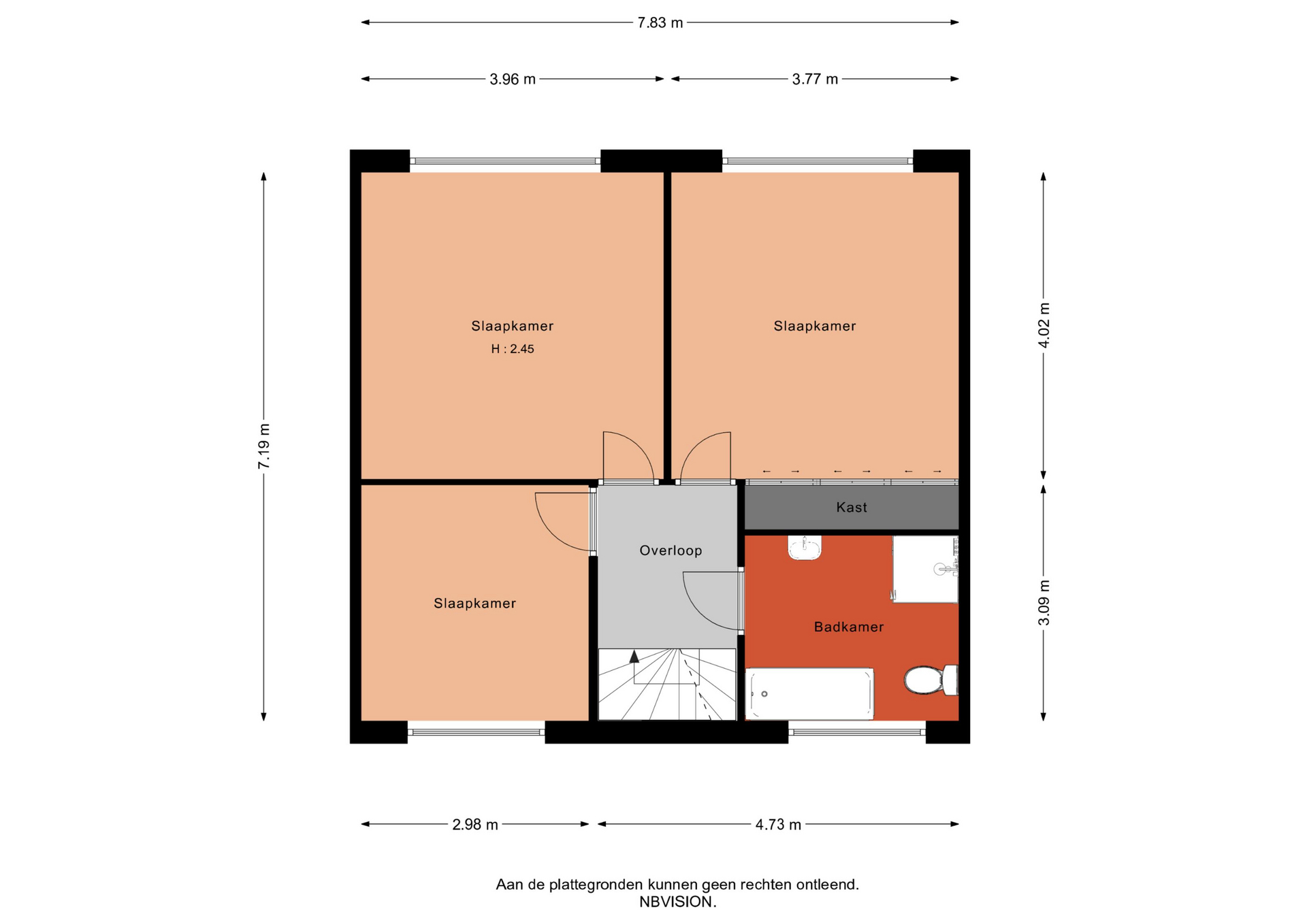 Via de ruime overloop heb je toegang tot drie slaapkamers, de badkamer en trapopgang naar de derde verdieping. Er bevindt zich een slaapkamer aan de voorzijde van circa 9 m² groot. De andere twee slaapkamers bevinden zich aan de achterzijde van de woning, zijn circa 16 m² en 15 m² groot, waarvan één slaapkamer is voorzien van een vast kast. Alle slaapkamers zijn voorzien van vloerbedekking en gespoten wanden.