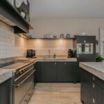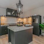 De landelijke open keuken heeft een L-vormige opstelling en een keukenblok met veel werk-/bergruimte. De keuken heeft een natuurstenen aanrechtblad en donkergrijze keukenkastjes. De keuken is volledig hout, dus liever een andere kleur dan is dit eenvoudig te realiseren. Verder is de keuken van alle gemakken voorzien van o.a.; een grote koelkast, losstaand Lacanche fornuis met twee ovens en met een mooie schouw, vaatwasser en een combi-oven/magnetron.