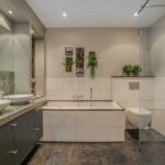 De riante badkamer van bijna 8m², is een fijne plek om te relaxen. Deze is voorzien van een whirlpool ligbad, dubbel wastafelmeubel met waskommen, grote inloopdouche, een hangend closet en een designradiator. Stijlvol is de nis met de spotjes.