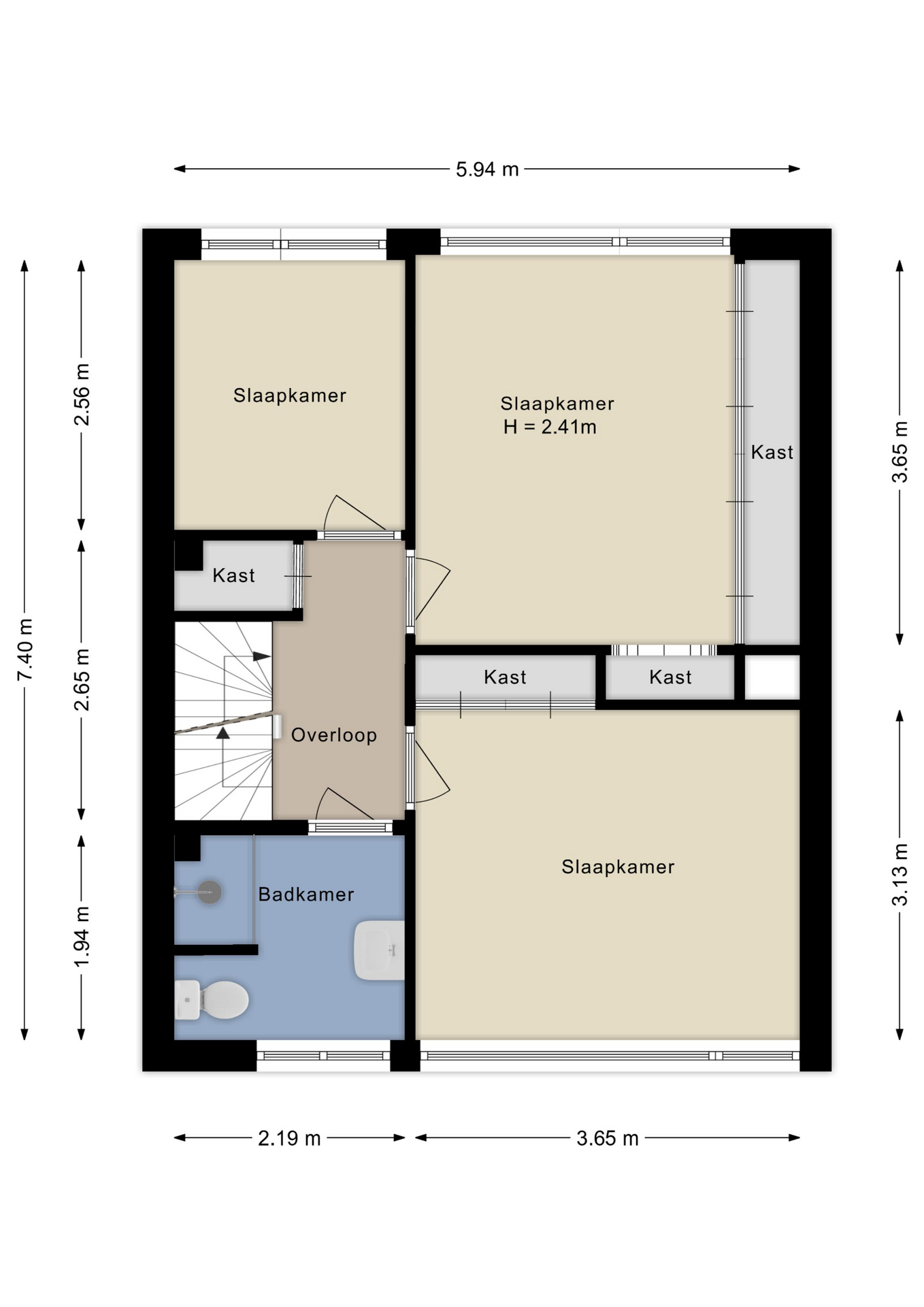 De eerste verdieping biedt ruimte voor iedereen. Aan de achterzijde vind je zowel een compacte kamer die ideaal is als werk- of kinderkamer, als de chique "masterbedroom", ruim genoeg voor een groot bed en veel kastruimte. Op de overloop is een praktische werkkast aanwezig om alles netjes op te bergen. Aan de voorzijde is een derde slaapkamer, licht, ruim en veelzijdig in te richten naar jouw wensen. De badkamer bevindt zich eveneens aan de voorzijde en is voorzien van een toilet, een modern wastafelmeubel en een inloopdouche. Alles strak afgewerkt en onderhoudsvriendelijk. Perfect om de dag fris te beginnen of ontspannen af te sluiten.