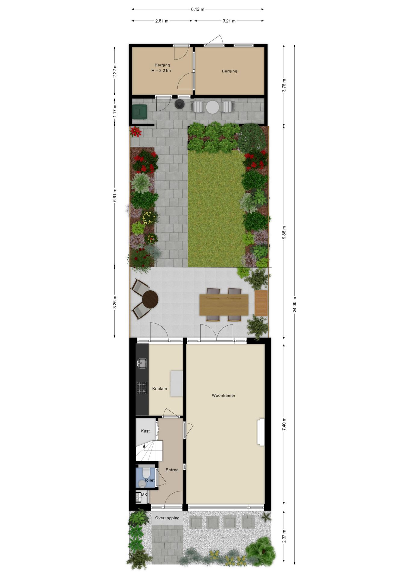 Laat je verrassen door de heerlijke achtertuin! De tuin is in perfecte staat en is gelegen op het zuidoosten, de tuin nodigt je uit om maximaal van de zon te genieten. Of je nu graag met een kop koffie in de ochtendzon zit, of ’s avonds met vrienden onder de sfeervolle overkapping relaxt, deze tuin biedt het allemaal. Heb je fietsen of tuingereedschap? Die berg je eenvoudig op in de aparte berging achterin de tuin. Bovendien is er een handige achterom, ideaal voor bijvoorbeeld het buitenzetten van afvalcontainers of het veilig stallen van fietsen.