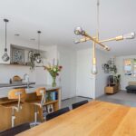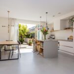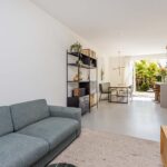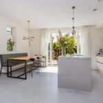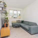 Het zijraam zorgt mede voor de lichtinval in de eethoek. Aan de voorzijde van de woning is de intieme woonkamer gesitueerd. De gehele begane grond is voorzien van een fraaie gietvloer en wordt verwarmd middels vloerverwarming.