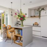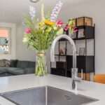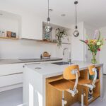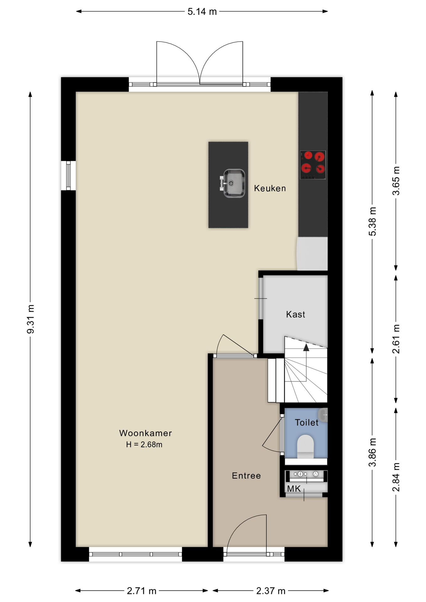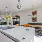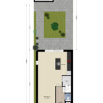 Ruime entree, modern toilet, meterkast en trapopgang, brede en vooral lichte woonkeuken met kookeiland, voorzien van inbouwapparatuur. Doordat de keuken aan de tuinzijde is gelegen, stap je via de openslaande deuren zo de fraai aangelegde tuin in. Zeker 's zomers maakt deze open verbinden dat je de tuin als extra leefruimte ervaart.