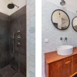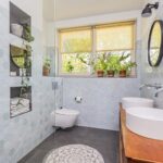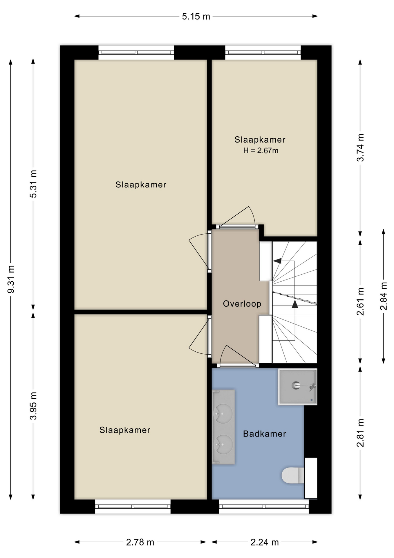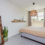 Overloop, 3 prettige slaapkamers met grote raampartijen en een moderne badkamer met inloopdouche, wc, wastafelmeubel met twee wastafels en een raam. Ook deze verdieping is voorzien van een mooie strakke gietvloer en vloerverwarming
