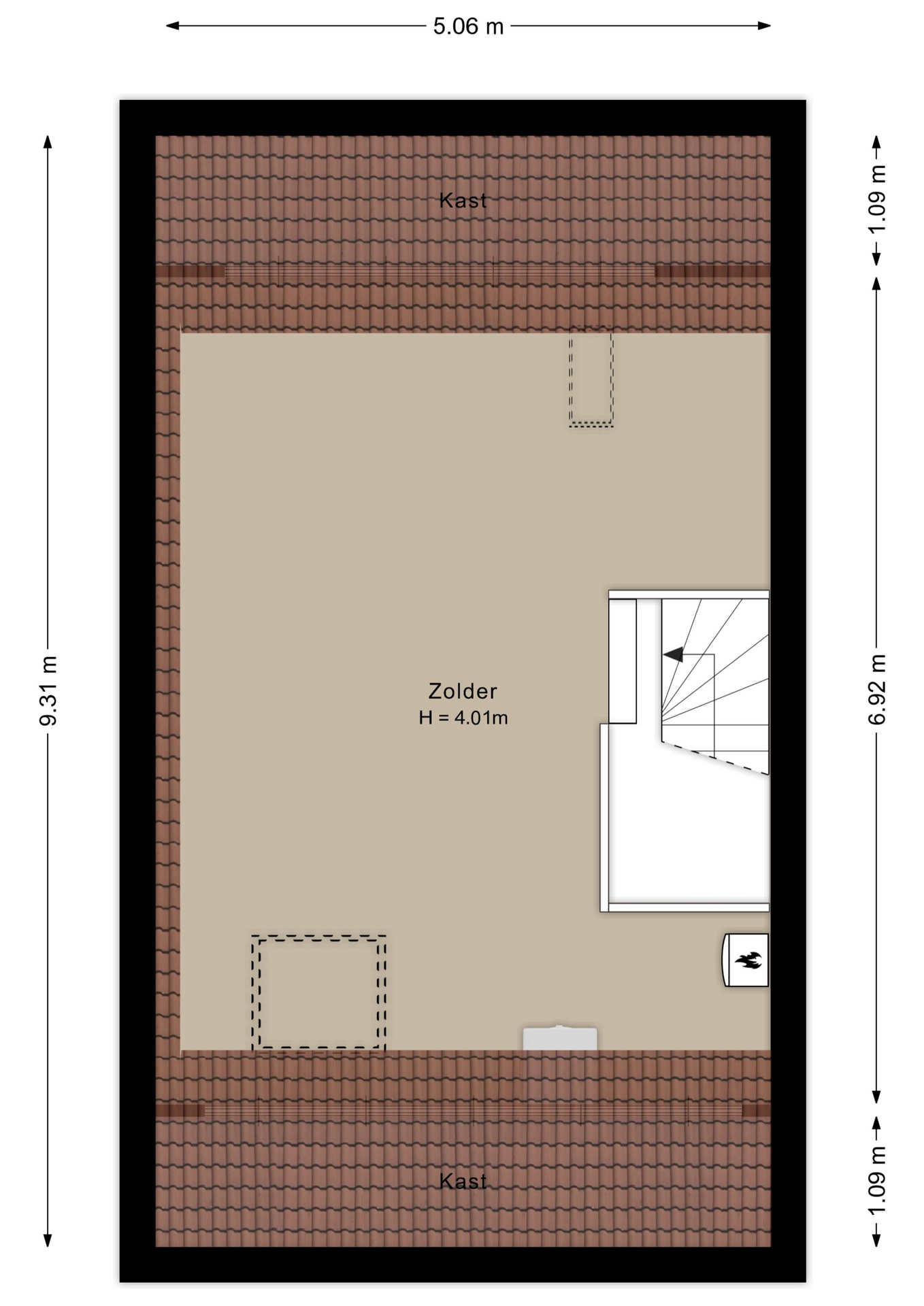 Grote open en hoge zolder welke momenteel is ingericht als logeerkamer en werkplek. Hier is door het plaatsen van een dakkapel aan tuinzijde en het plaatsen van scheidingswanden mogelijk om een of twee afzonderlijke kamers te creëren. Ook de de wasmachine en droger bevinden zich op deze verdieping net als de c.v.-ketel en de mechanische ventilatie unit.